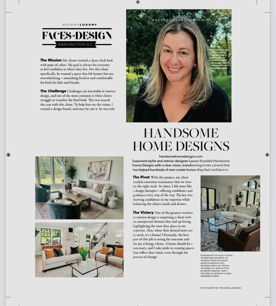 Lauren McFarland is a Northern Virginia interior designer and founder of Handsome Home Designs with over seven years of experience turning spaces into stylish sanctuaries. After her own divorce, she realized a niche market when single men in her circle sought her expertise to create stylish, comfortable homes – especially those in transition or starting over.